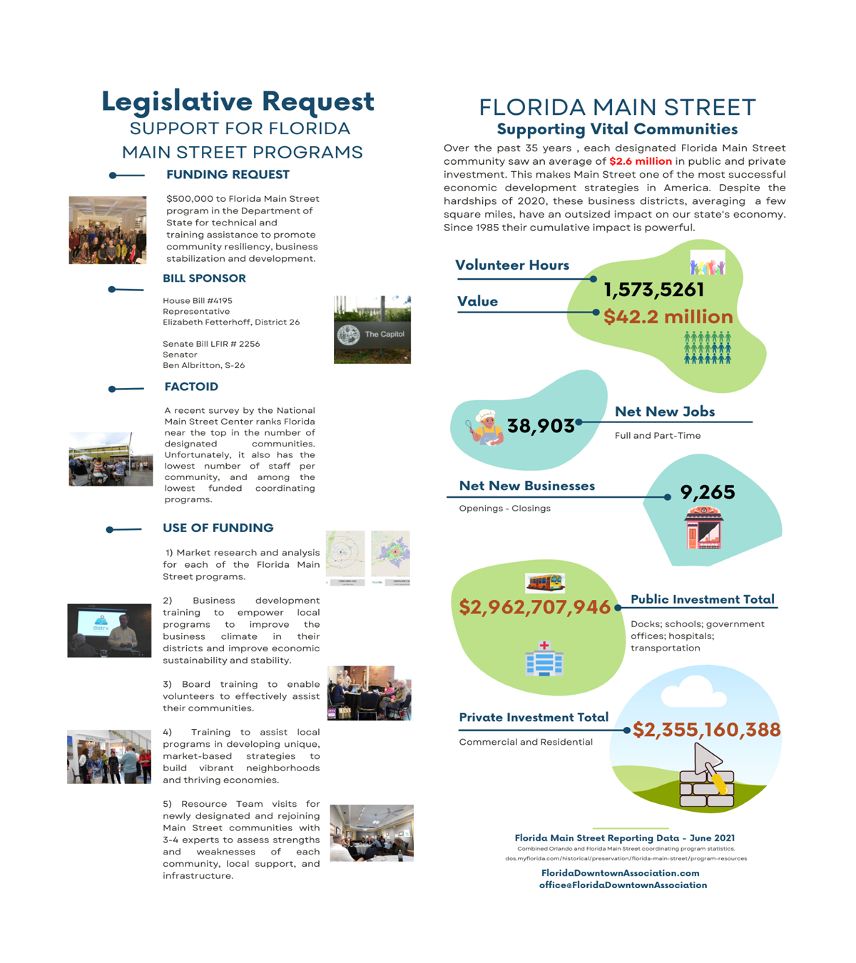 There are several items in front of this year’s Florida legislature that are very important to the health and well being of all Florida’s Main Street communities. Together we can champion these requests and bring new opportunities to your Main Street.